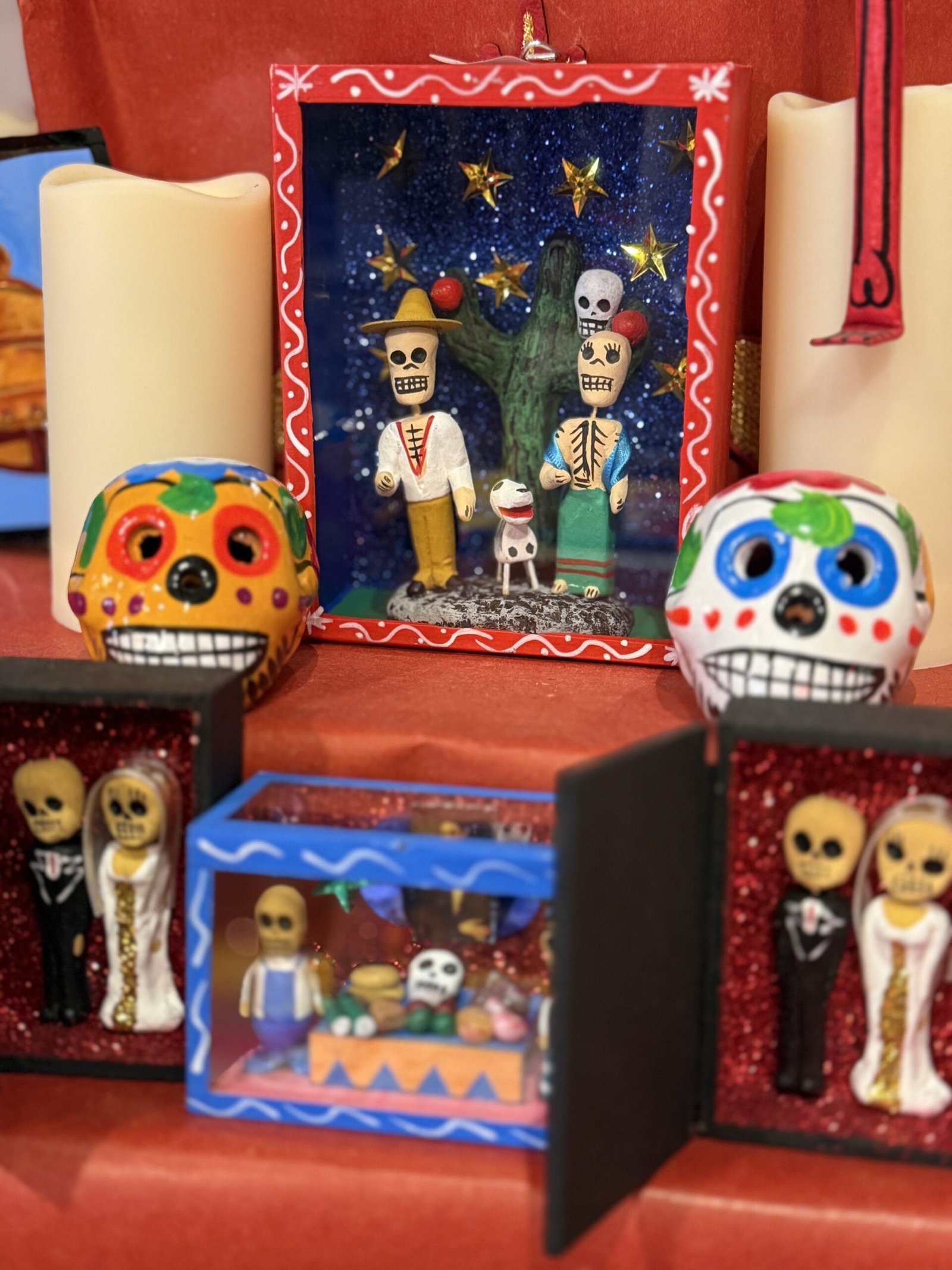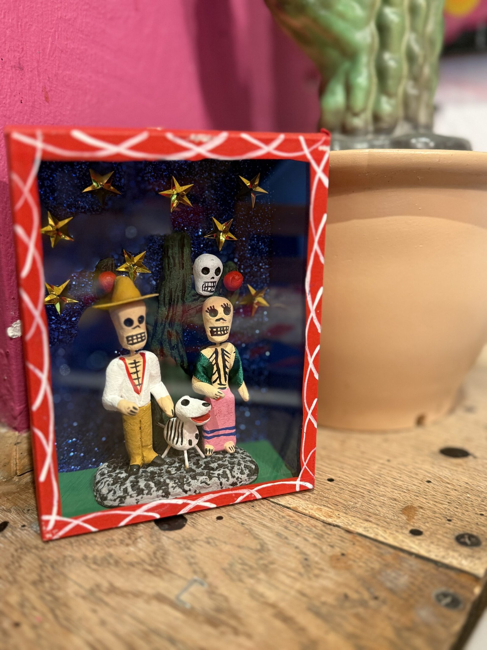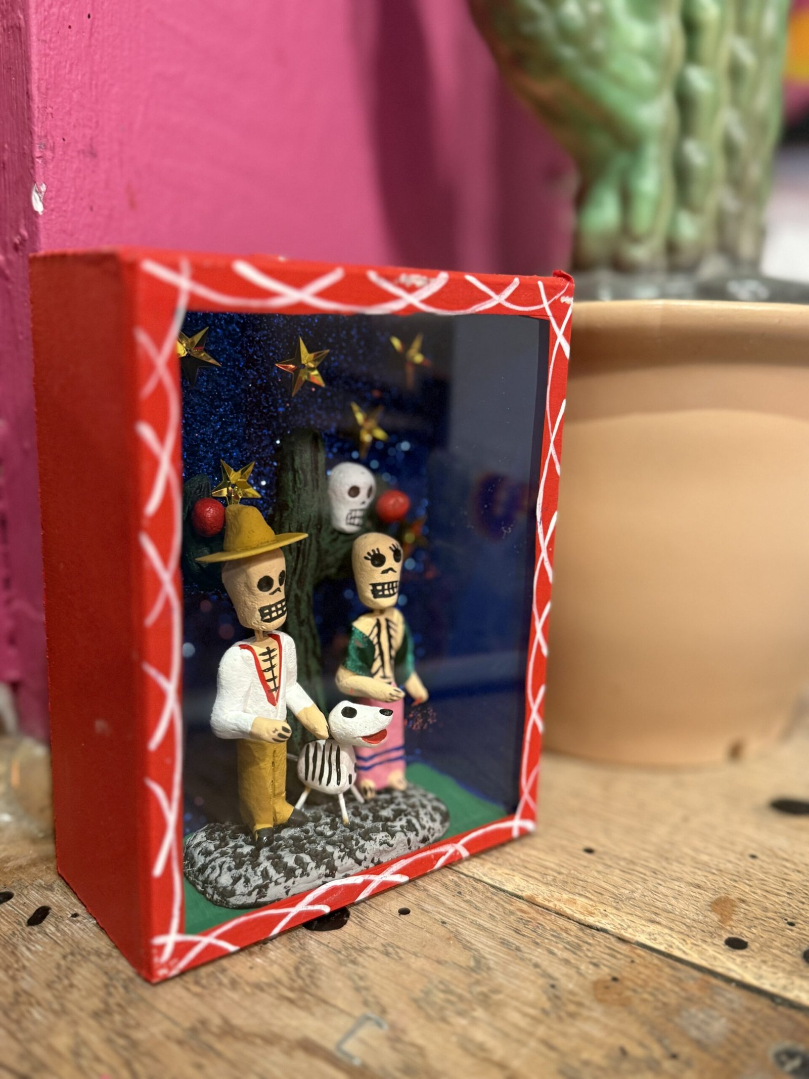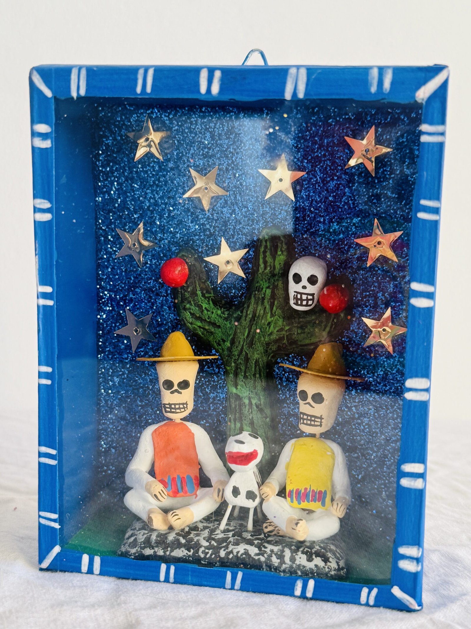 handmade Mexican craft blue shadow box featuring dos amigos, cactus and a dog