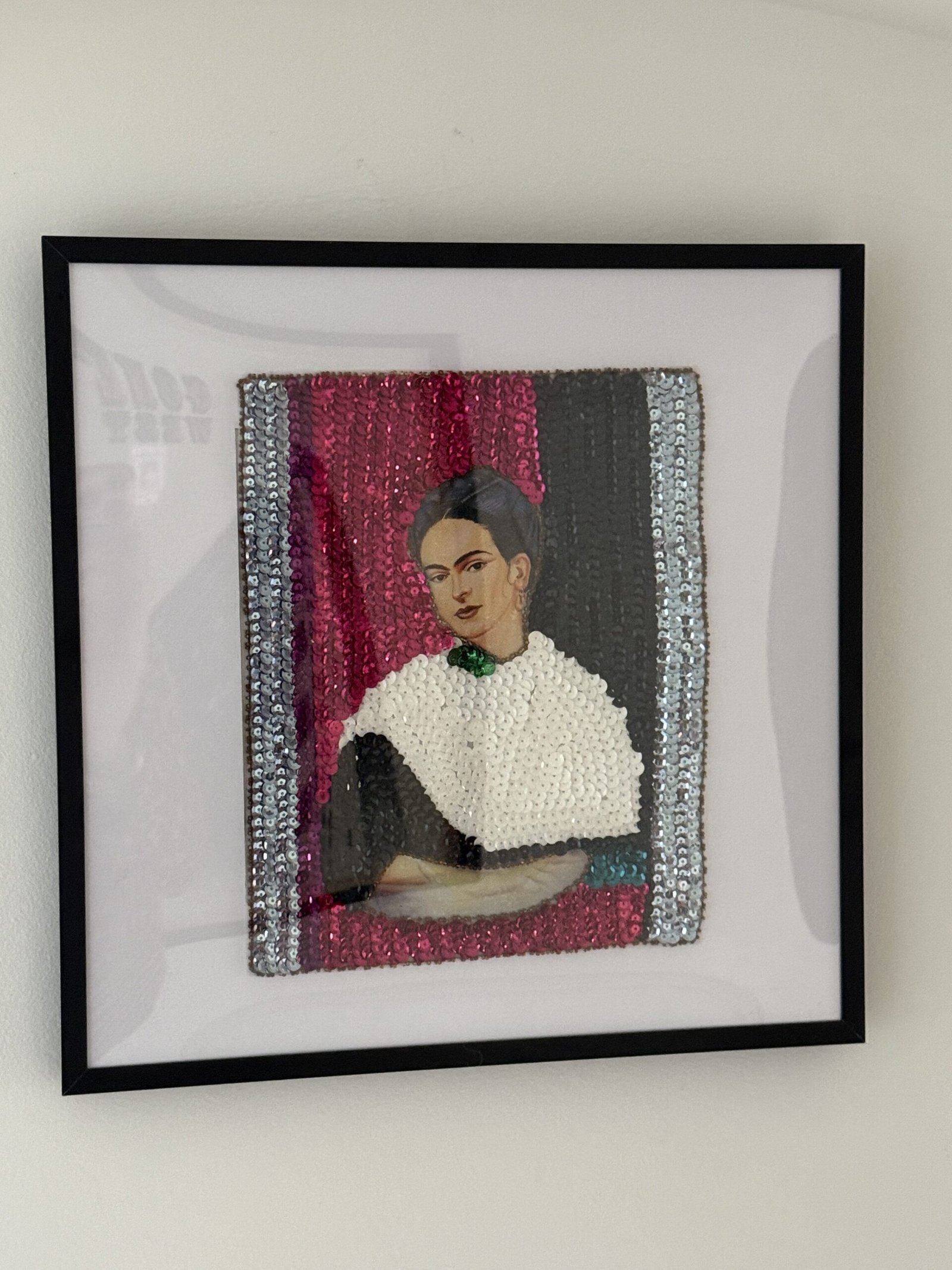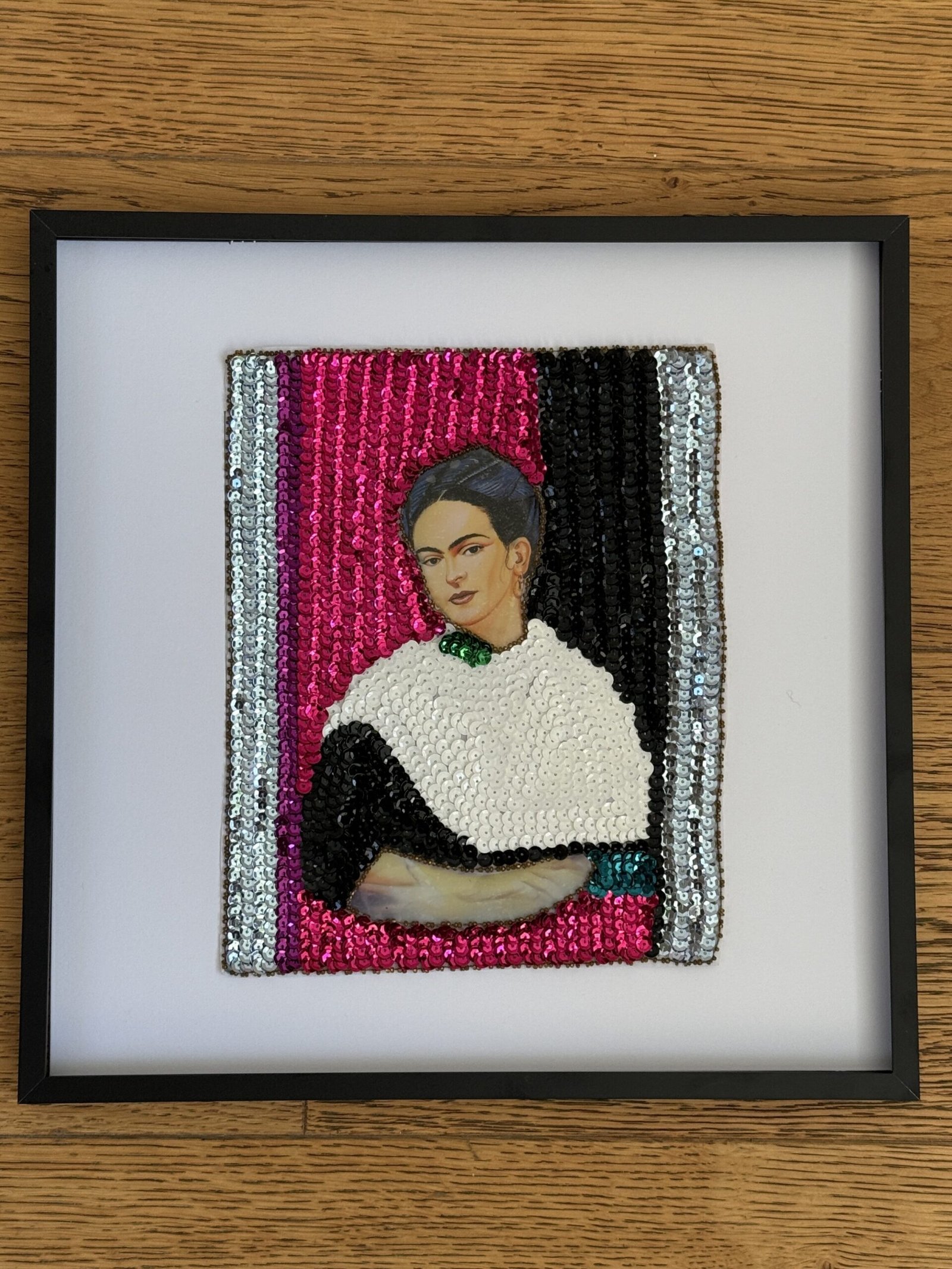 Handmade pink and black Frida Kahlo patch framed with pink, black and gold backgrounds