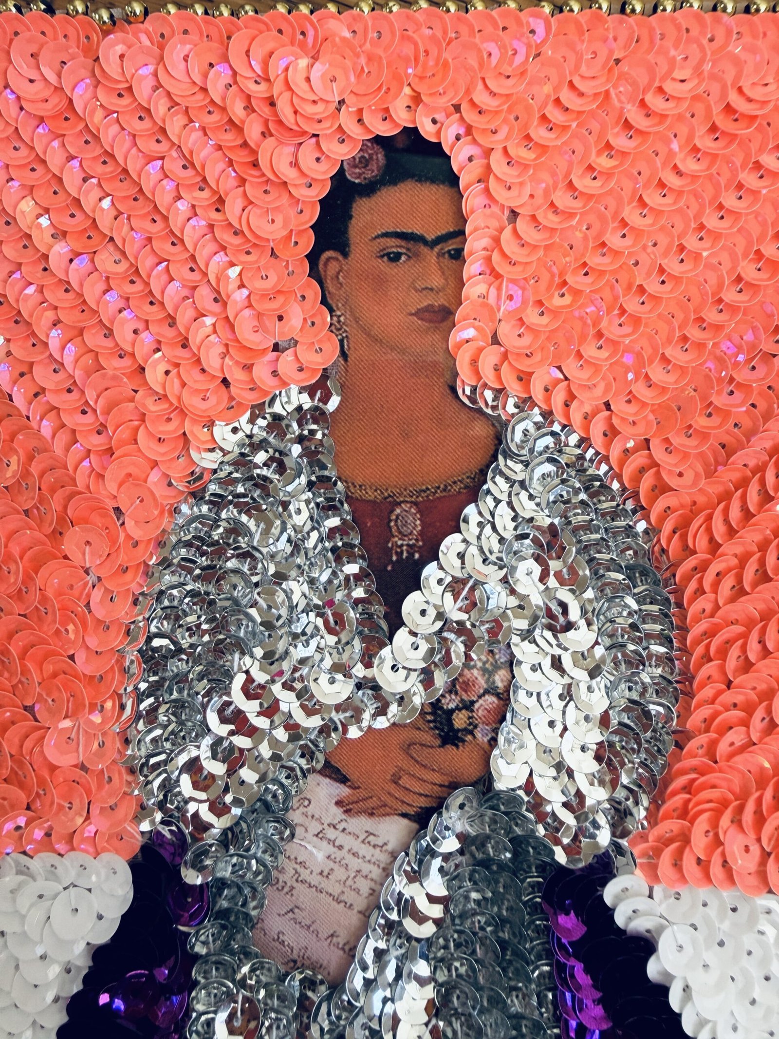 Handmade sequinned Frida Kahlo patch with orange and white background