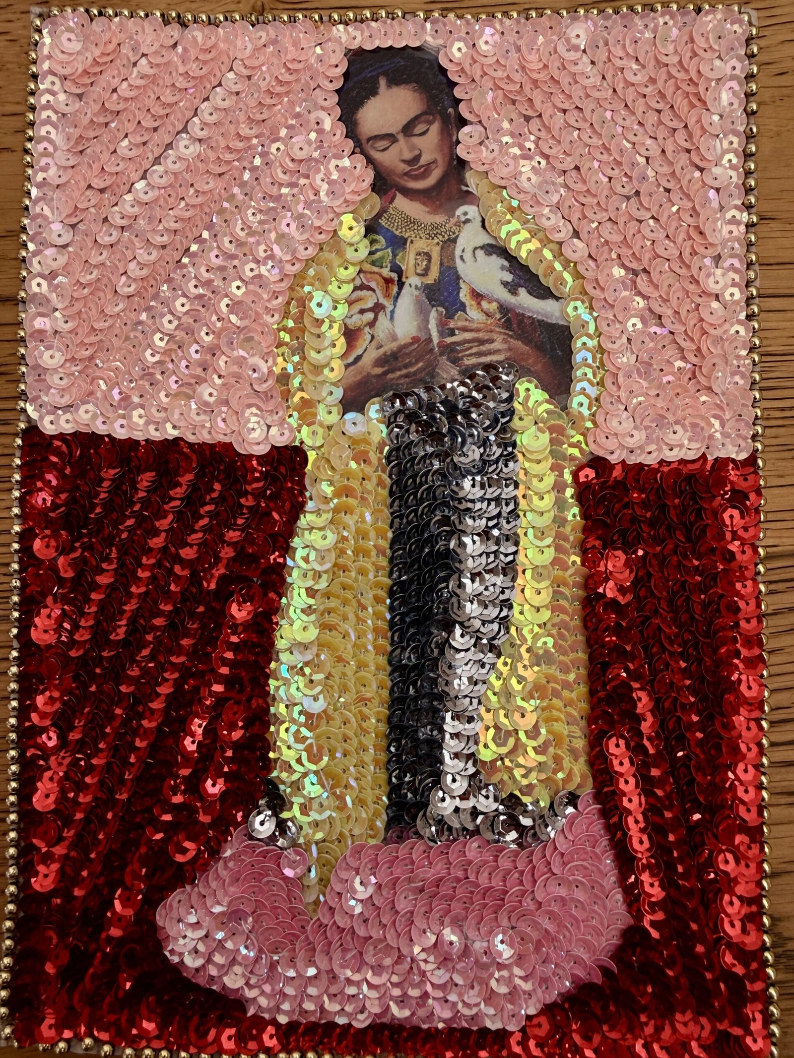 Frida Kahlo with doves sequin patch, pink and red background