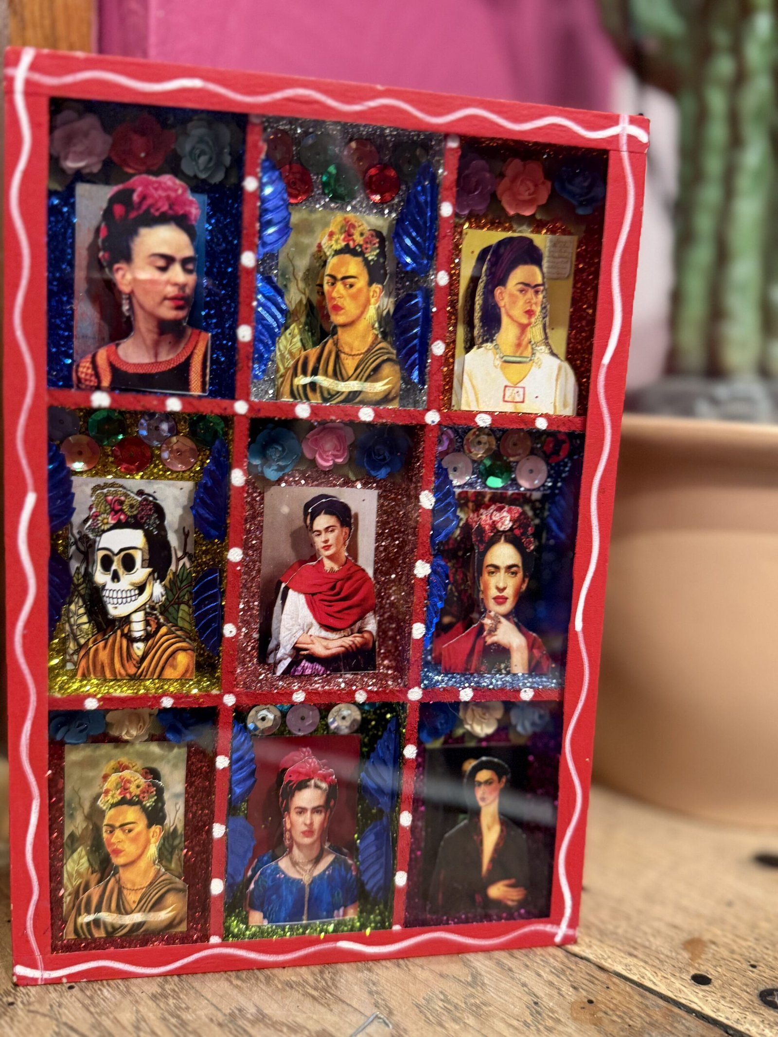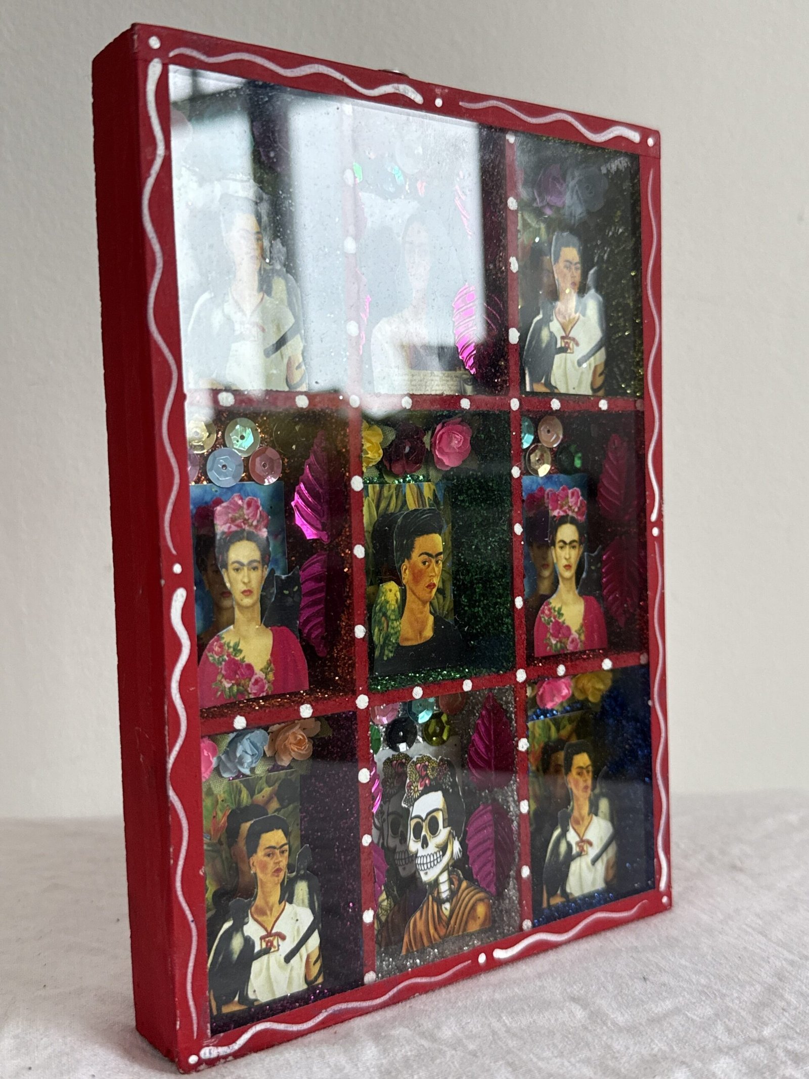 Hand made shadow box featuring  nine various images of the famous Mexican artist Frida Kahlo