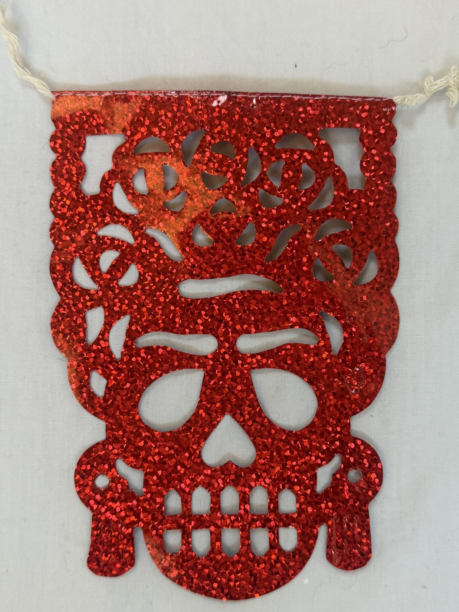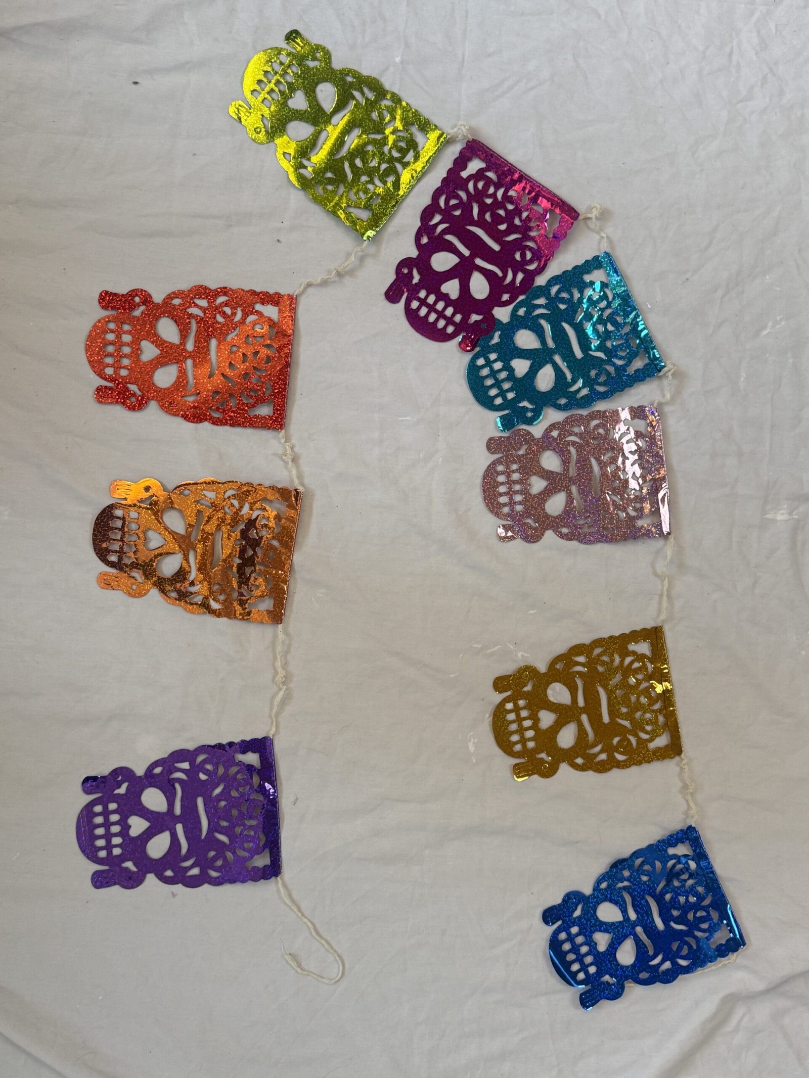 Handmade in Mexico traditional Day of the Dead decorations in multicolour glittery metalic plastic featuring 10 images of Dia de Los Muertos