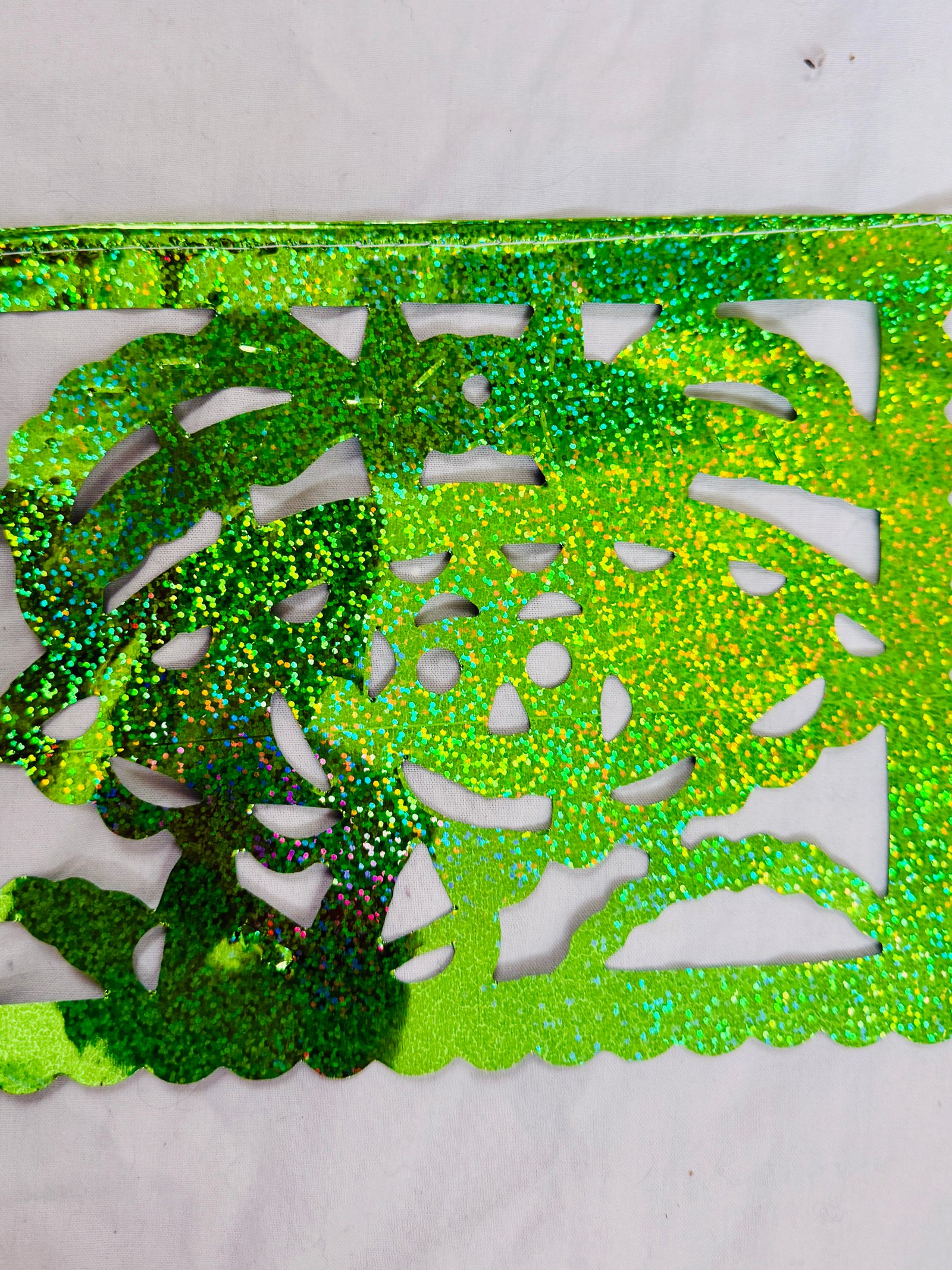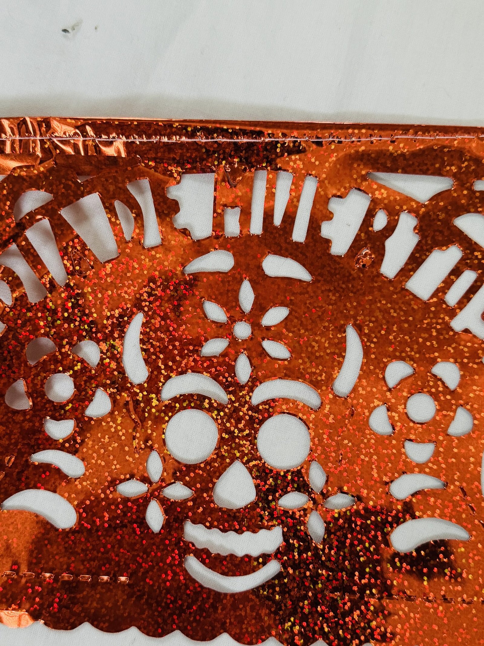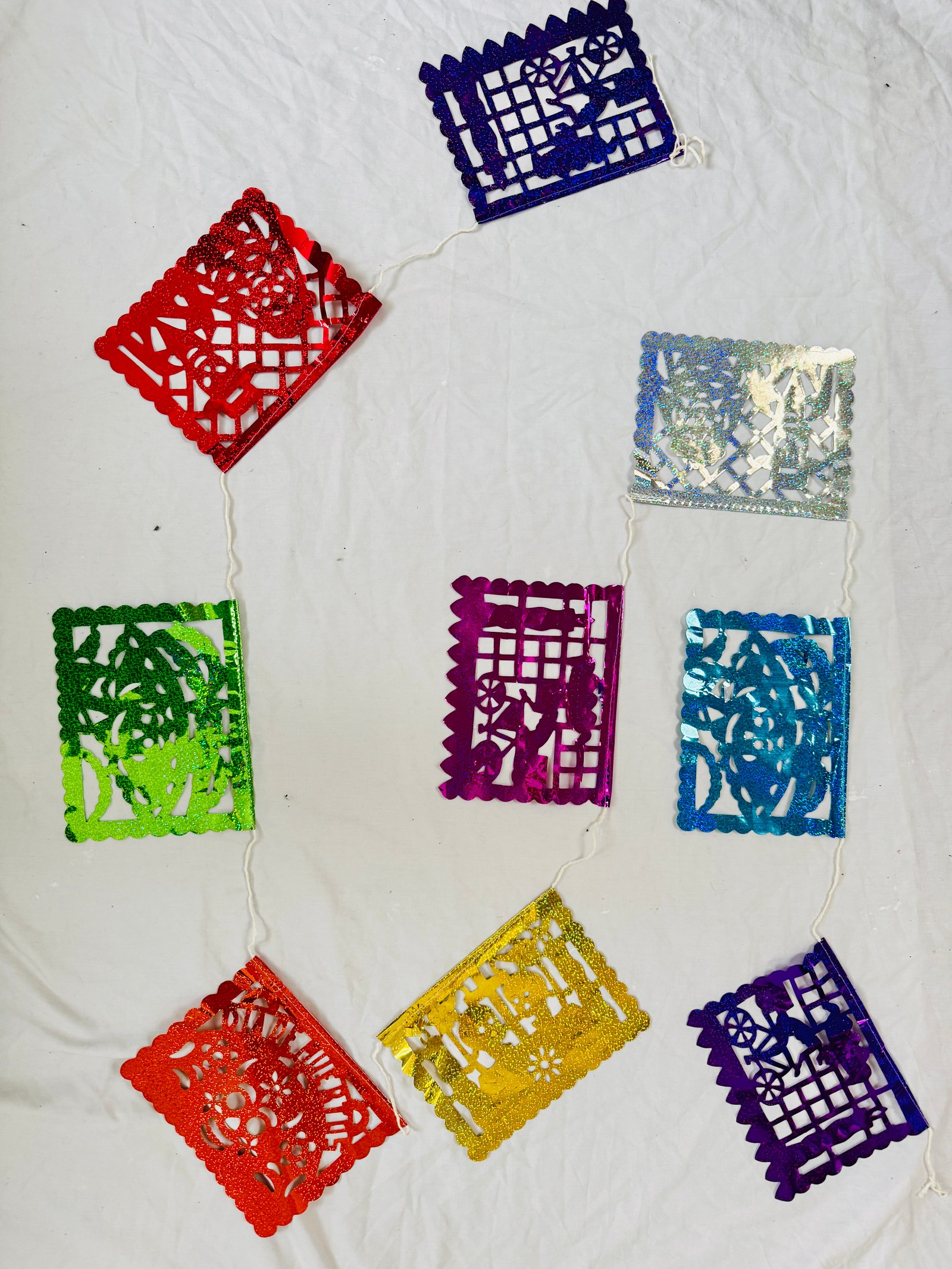 Handmade in Mexico traditional Day of the Dead decorations in multicolour glittery metalic plastic featuring 10 images of Dia de Los Muertos